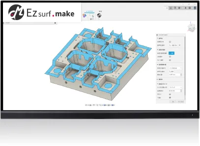 Ezsurf.makeを利用することで、従来手作業で数十分から場合によっては一日以上かかっていた延長面の作成時間を、およそ70%以上も短縮可能です。具体的には、サーフェイスの自動取得機能や、延長面を生成しながら補完面や穴埋めを同時に行う機能が搭載されています。この直感的なUIのおかげで、複雑な操作を求めず、CAMのスキルを問わず誰でも扱える設計です。