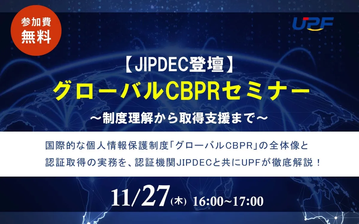 株式会社UPFは、リスクマネジメントのコンサルティングを行う企業で、東京都中央区に本社があります。この度、同社は一般財団法人日本情報経済社会推進協会(JIPDEC)をゲストに迎え、2025年11月27日(木)に『グローバルCBPR(Global Cross-Border Privacy Rules)』についての無料オンラインセミナーを開催することが決定しました。