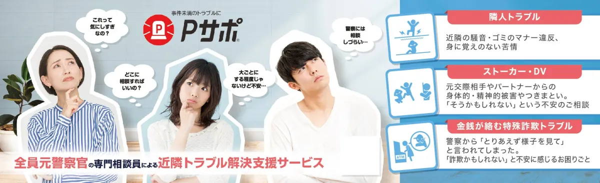「Pサポ」とは、元警察官が相談員として加盟するサービスで、騒音、迷惑行為、つきまとい、そしてSNSによる誹謗中傷といった問題を、迅速かつ的確に解決へ導くことを目指しています。具体的には、事件に発展する前のトラブルに対処し、相談者が安心して生活できるようサポートを行います。相談は電話またはメールで可能で、利用者は気軽に相談できます。