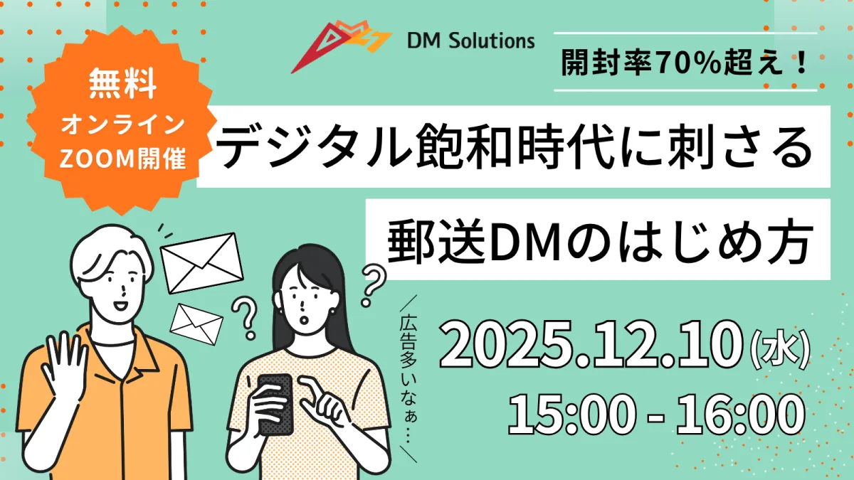 そこで、ディーエムソリューションズ株式会社が「開封率70%超え!デジタル飽和時代に刺さる郵送DM発送のはじめ方」と題したウェビナーを開催します。このイベントは、郵送DMを活用したいと考えている企業や、既にDMを利用しているが方法に不安を感じている企業の皆様に向けて、具体的なノウハウを提供するものです。