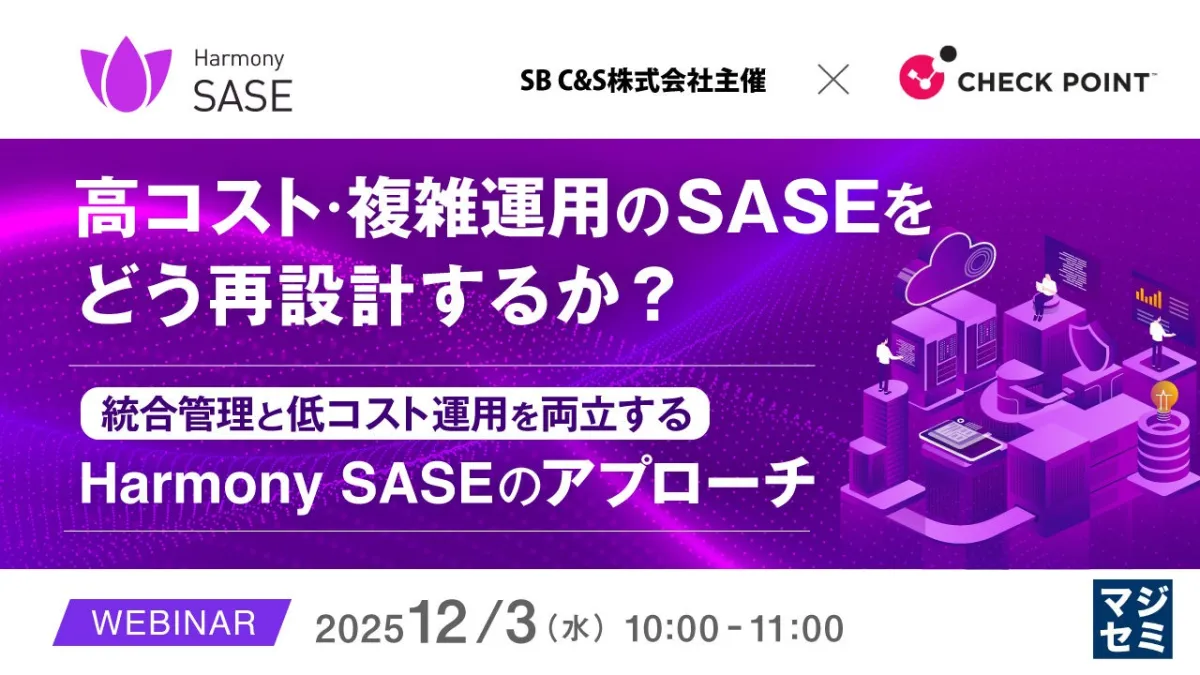このウェビナーは、SB C&S株式会社とチェック・ポイント・ソフトウェア・テクノロジーズ株式会社の主催で行われます。また、協力として株式会社オープンソース活用研究所やマジセミ株式会社が参画しています。詳細な参加方法や申込みについては、公式サイトにて確認できます。