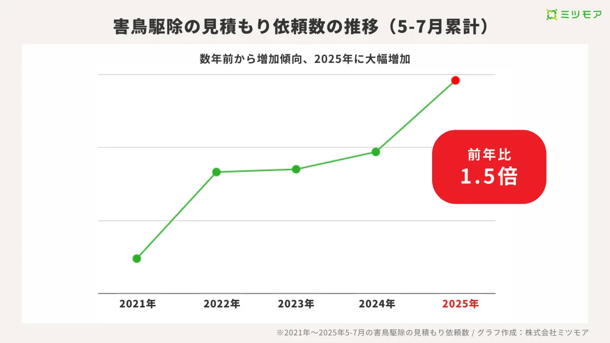 今年の夏は異常な猛暑が続き、特に都市部での害鳥被害が深刻化しています。株式会社ミツモアが実施した調査により、東京都での害鳥駆除見積もり依頼が前年同月比で2.8倍も増え、愛知県でも2.1倍の数字を記録したことが報告されました。このような状況は、春から夏にかけての繁殖期や猛暑による影響が大いに関与しています。