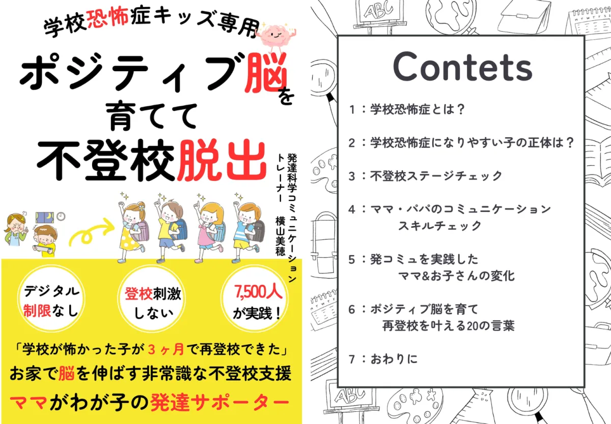 「学校恐怖症キッズ専用ポジティブ脳を育てて不登校脱出」は、子どもたちの心を理解し、具体的なアプローチを示すガイドです。著者の横山美穂さんは、発達科学コミュニケーショントレーナーとして、数多くの親子と向き合ってきた経験をもとに、親たちがどのように子どもにアプローチすれば良いかを丁寧に説明しています。たとえば、子どもの心のSOSに気づくための方法や、日常生活の中で実践できるコミュニケーションのテクニックが紹介されています。