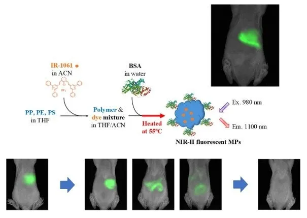 今回の研究では、ポリプロピレン(PP)、ポリエチレン(PE)、ポリスチレン(PS)の各素材に近赤外蛍光色素を内包することで、複数の蛍光MP粒子の合成に成功しました。これにより、マウスに対する経口投与実験を通じて、MPsが体内でどのように分布し、移動するかを追跡できるようになったのです。これまでの手法は臓器の摘出を伴うため、MPsの動態を連続的に観察することが難しかったですが、今回の方法では生体に直接的な影響を与えずに、深部組織におけるMPsの挙動を観察することができます。