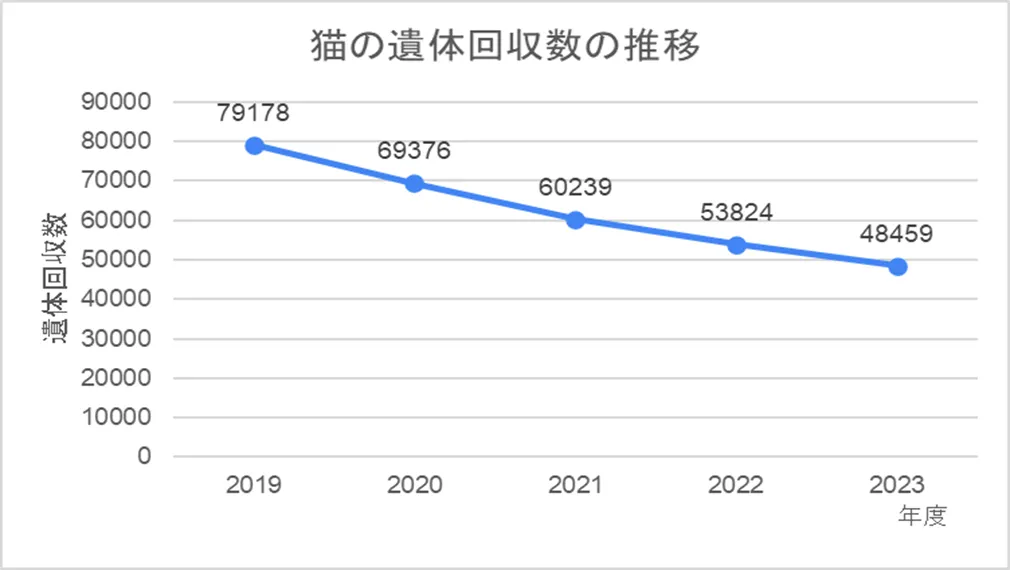 - - 猫の回収数は2023年に48,459頭に減少し、前年の79,178頭から37.5%の減少を示しました。このデータから推計すると、全国で死亡した猫の数は127,730頭と見積もられます。