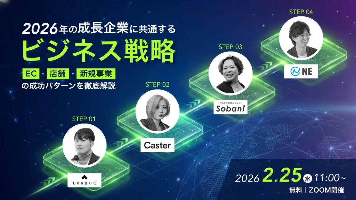 株式会社LeaguEが主催するオンラインセミナー「2026年の成長企業に共通するビジネス戦略― EC・店舗・新規事業の成功パターンを徹底解説 ―」が2026年2月25日(水)11時から開催されます。このセミナーでは、株式会社LeaguE、株式会社キャスター、株式会社そばに、NE株式会社の4社が共催し、成長企業に共通する戦略を徹底的に解説します。