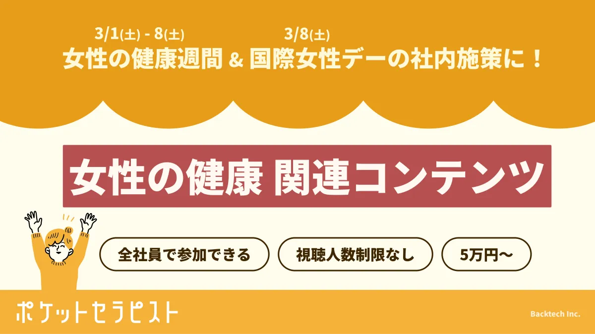 株式会社バックテックは、メンタルヘルス施策を推進する「ポケットセラピスト」を通じて、女性の健康週間に合わせた特別なコンテンツを提供します。このプログラムは、2024年3月1日から3月8日まで行われ、「国際女性デー」に響く形で、女性特有の健康課題にも配慮されています。