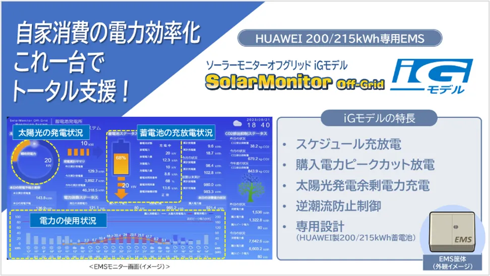 株式会社イグアスは、エナジー・ソリューションズ株式会社 (ESI社)との協力により、HUAWEI製の200/215kWh蓄電池専用の高機能エネルギー管理システム(EMS)「SolarMonitor Off-Grid [iGモデル]」を発表しました。この新製品は、2026年3月16日から販売が開始されます。
