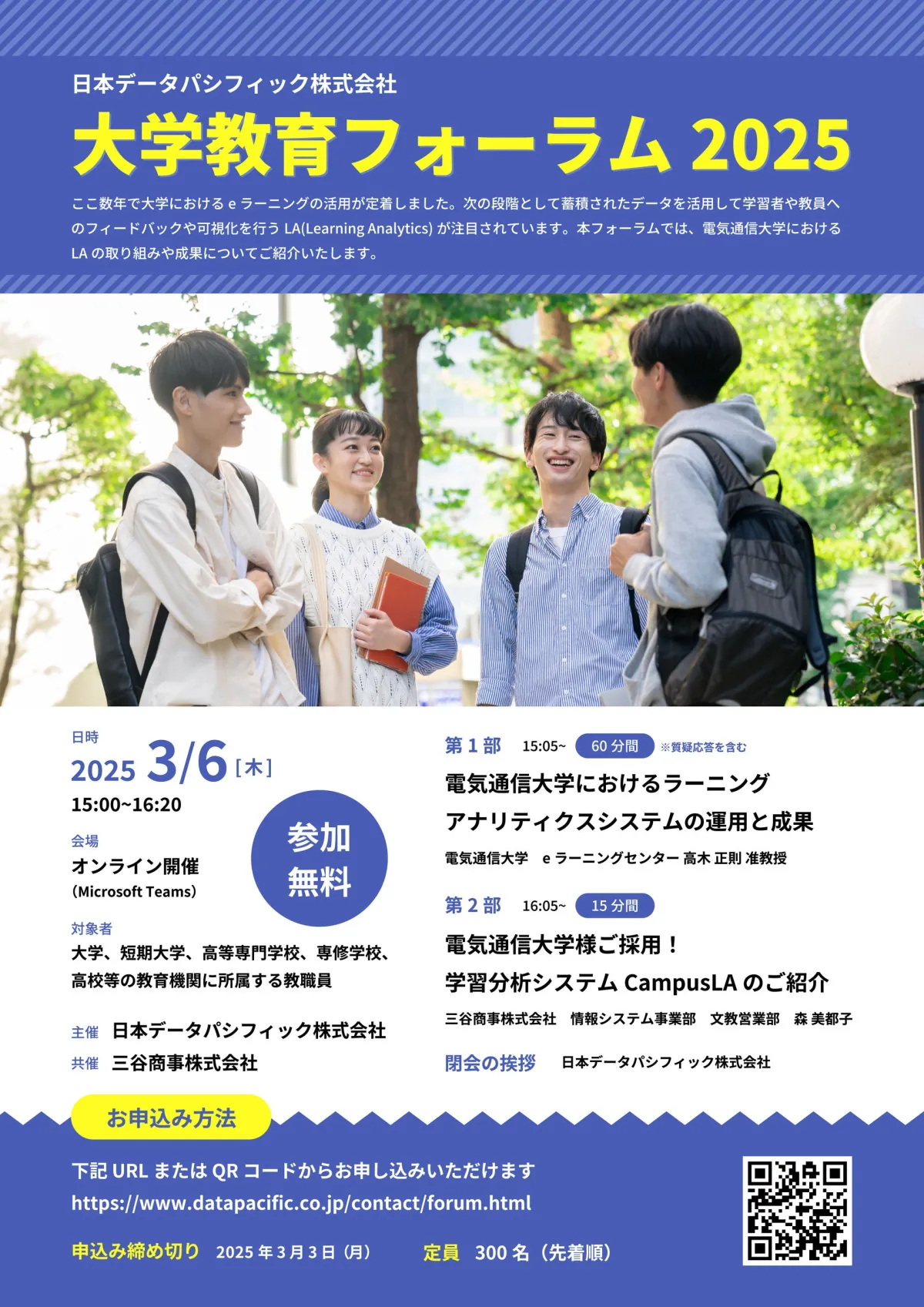 学びが進化する現代において、教育の質向上を目指す取り組みがますます注目を集めています。そんな中、日本データパシフィック株式会社が主催する「大学教育フォーラム2025」が、2025年3月6日(木)にオンラインにて開催されます。本セミナーは、特に大学などの教育機関において、eラーニングの導入が進んできた背景を受けて、今後の学びをどう進化させるかを議論する貴重な機会です。