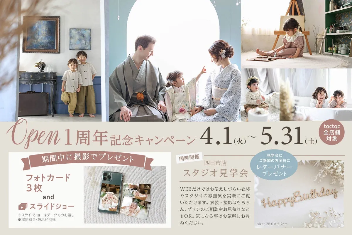 株式会社タートルが運営する「photo maison toctoc」の四日市店と春日井勝川店が、皆様のご支援のおかげで1周年を迎えます。この記念すべきイベントを祝し、特別キャンペーンを開催します。期間は2025年4月1日から5月31日までの約2か月間、対象となるのはこの期間に撮影されたすべてのお客様です。既に予約済みの方も対象となりますので、ぜひご参加ください。
