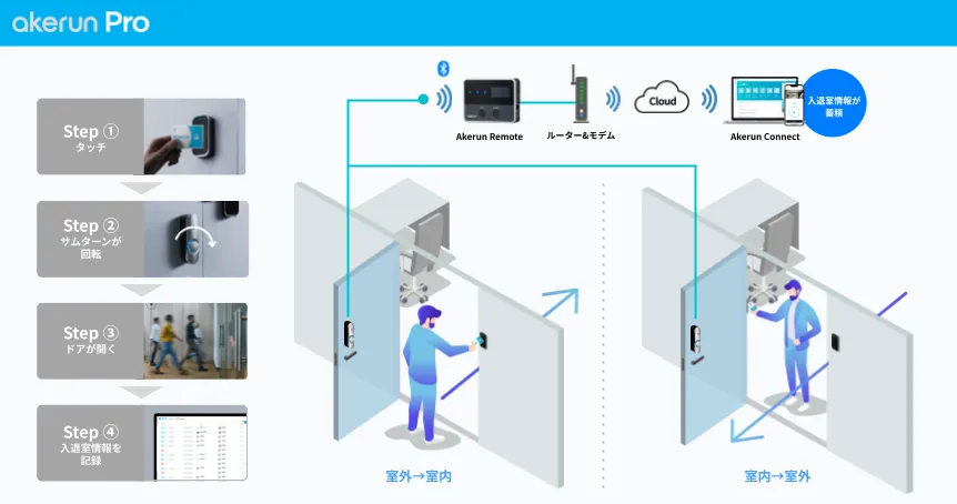 Akerunは、スマートロックを用いた入退室管理システムです。利用者は事前にAkerunのアプリで登録を行い、スマートフォンやICカードを使用して入口の施錠・解錠が可能です。このシステムは工事が不要で、従来の有人店舗に比べて人件費を削減しつつ、広い営業時間を実現しました。
