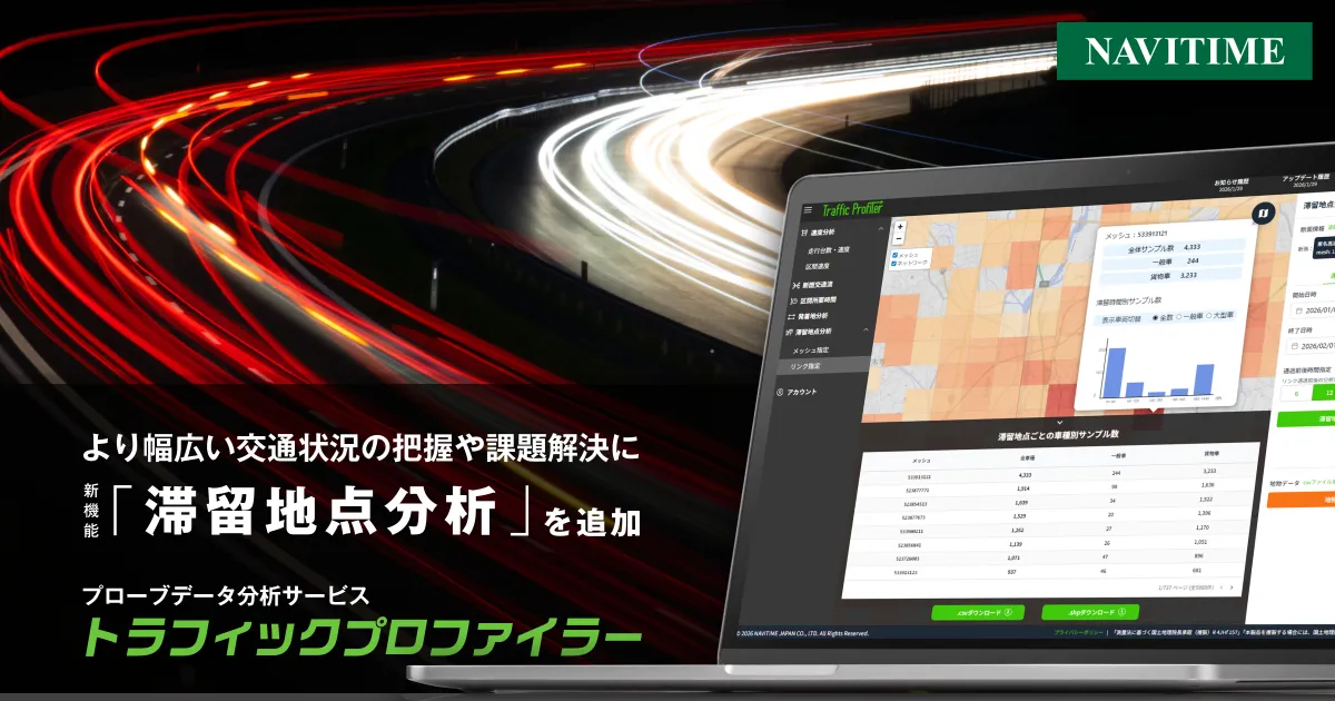 株式会社ナビタイムジャパン(大西啓介社長)は、2026年2月12日より、自社のプローブデータ分析サービスに新機能「滞留地点分析」を追加し、サービス名を「トラフィックプロファイラー」に変更します。これは道路単位だけでなく、地域全体の交通状況を多角的に把握できる強力なツールです。
