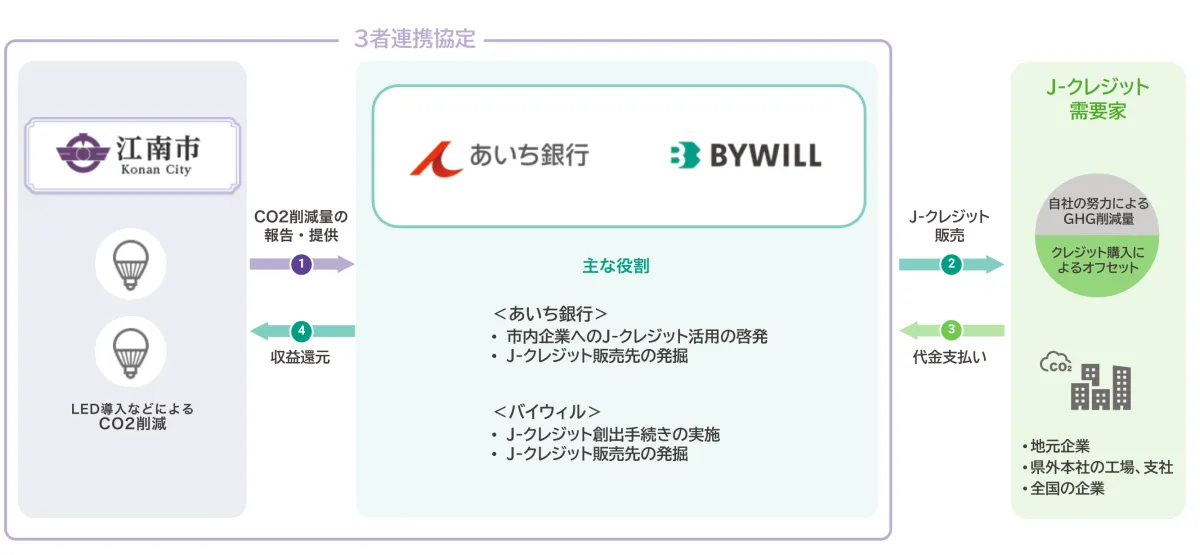 江南市は2023年に「ゼロカーボンシティ」を宣言して以来、その目標に向けた取り組みを進めてきました。この取り組みは、地域の持続可能な発展に寄与するだけでなく、全国47都道府県においてカーボンニュートラルの実現を目指す行動の一環でもあります。あいち銀行は、地域社会への貢献を重視し、バイウィルと連携して顧客紹介契約を締結し、地域の脱炭素化を共に目指してきました。