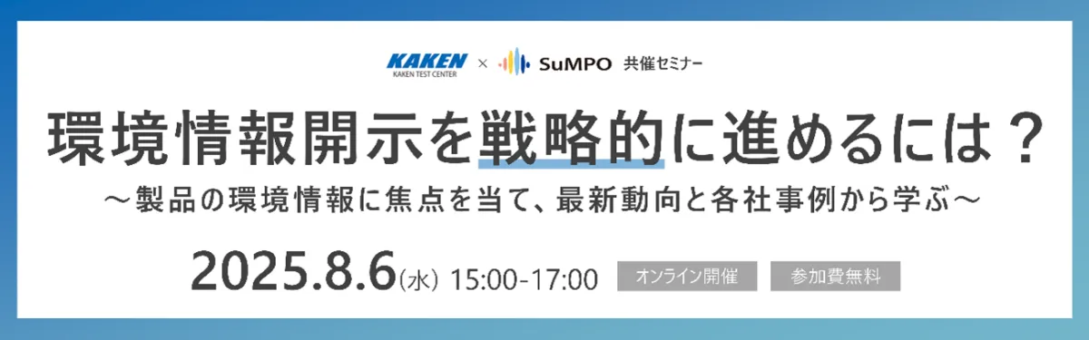 そんな中、一般社団法人サステナブル経営推進機構(SuMPO)と一般財団法人カケンテストセンターが共催で行うセミナーがこの8月に開催されます。このセミナーでは、環境情報開示に関する最新の動向を把握する機会として、さまざまな企業の実践例が紹介されます。