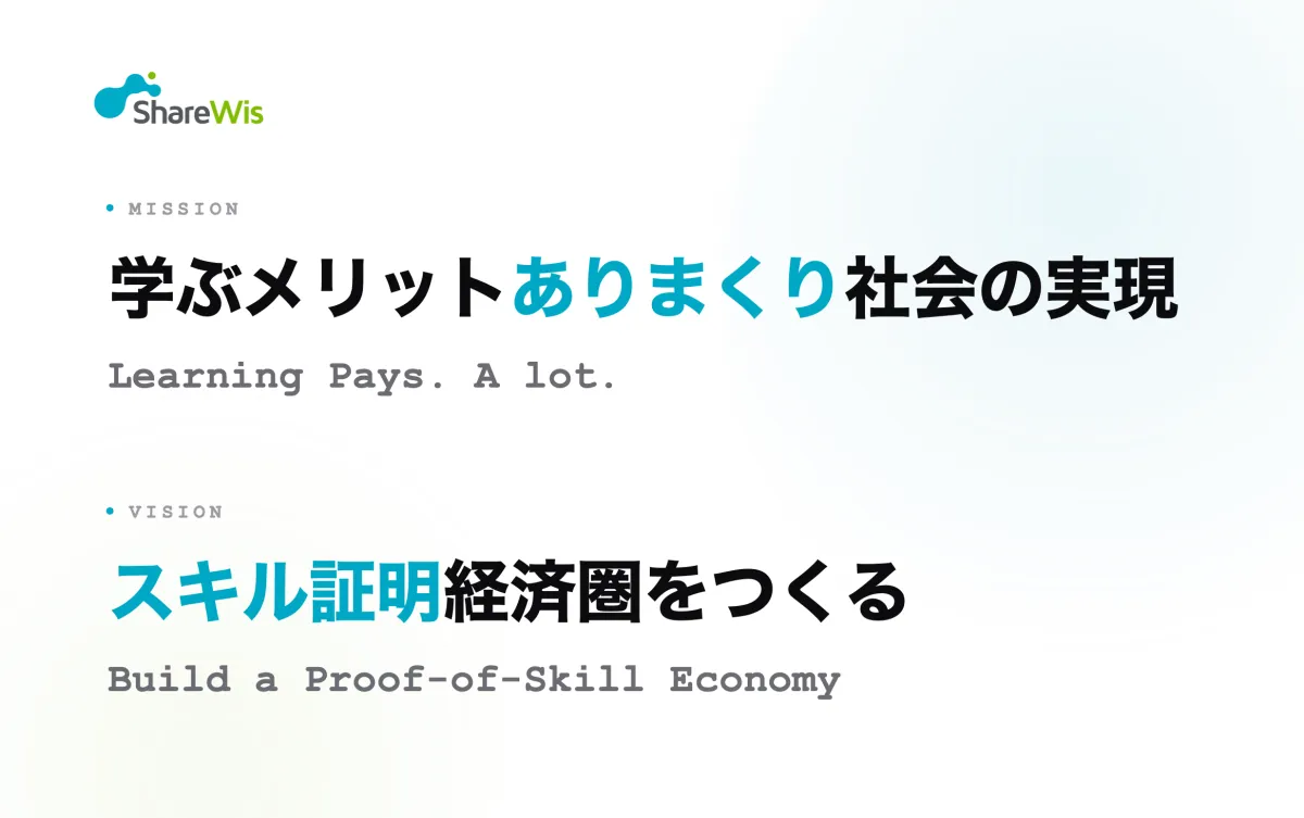 株式会社シェアウィズが、学習管理システム「WisdomBase」を提供するにあたり、新しいミッションとビジョンを発表しました。新しい使命は「学ぶメリットありまくり社会の実現」、ビジョンは「スキル証明経済圏をつくる」です。これにより、個人のスキルが確かなデータとして流通する社会の実現を目指しています。