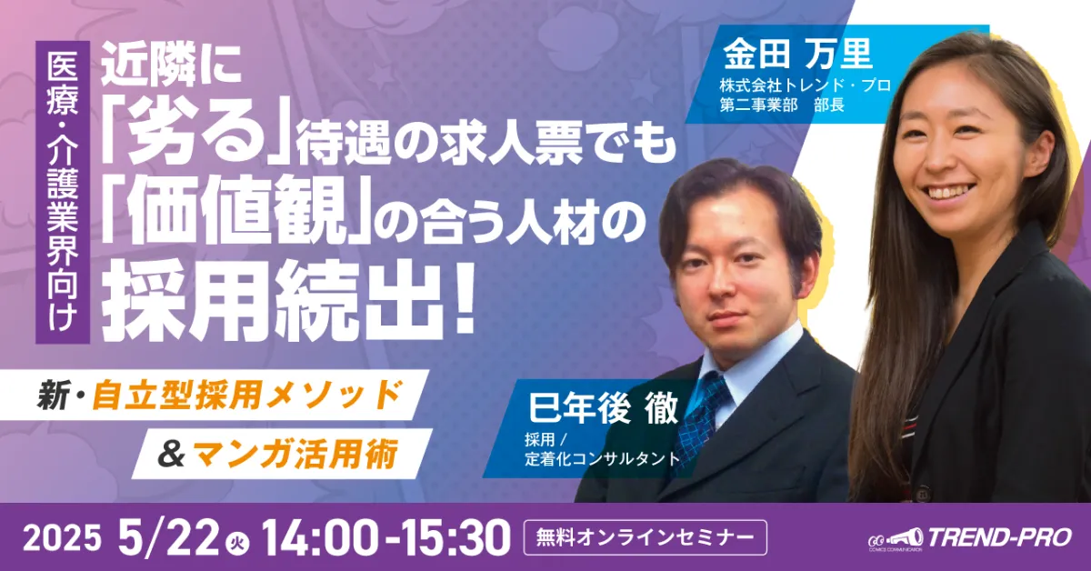 株式会社トレンド・プロは、医療・介護業界の人材不足に対応するため、画期的なオンラインセミナーを開催します。少子高齢化の影響で、医療・介護現場では深刻な人手不足が継続。特に看護師や介護士などの専門職は、採用競争が激化しています。このような背景から、従来の採用手法では十分な効果が望めず、多くの施設が人材を確保できずにいます。そこで、トレンド・プロは専門のコンサルタントと協力して、新たに自立型採用メソッドとマンガの活用方法を紹介することになりました。