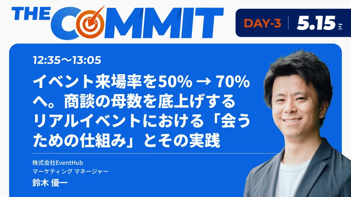 続いて、行われる「THE COMMIT BtoBマーケティング/セールスの戦略と実行を結ぶ3Days」では、鈴木氏が、「イベント来場率を50% → 70%へ」のセッションに登壇します。このセッションでは、具体的な施策として「商談の母数を底上げする、リアルイベントにおける会うための仕組み」とその実践について議論が交わされます。これにより、参加者は自身のビジネスにおける実践的なテクニックを学ぶことができます。