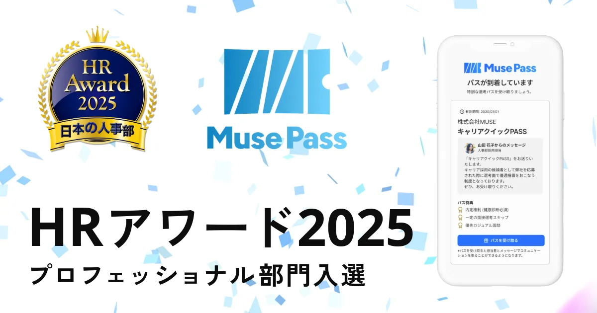 MusePass(ミューズパス)が、2025年の日本の人事部「HRアワード」のプロフェッショナル部門に選ばれました。これは、内定辞退者との再接点を可能にする革新的なサービスとして、多くの評価を得ています。