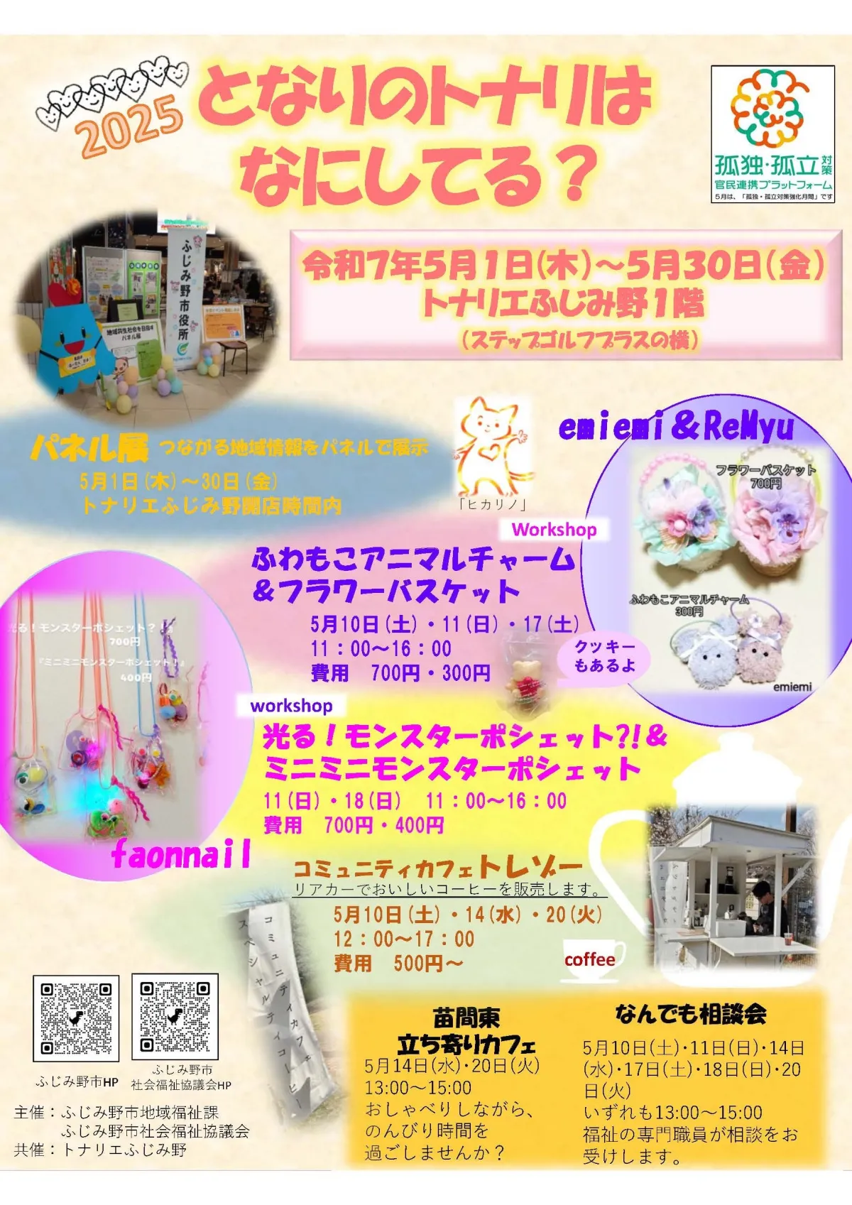 このイベントは、令和7年5月1日から30日までの間、トナリエふじみ野の1階にて行われます。地域の特性を活かした様々な活動が計画されており、例えばパネル展示やハンドメイドワークショップ、おしゃべりカフェ、相談会などが行われます。