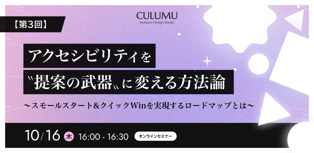 株式会社STYZが運営するインクルーシブデザインスタジオCULUMUは、2025年10月16日(木)16時から「アクセシビリティを〝提案の武器〟に変える方法論」セミナーを開催します。オンラインで行われるこのセミナーは、アクセシビリティをビジネスに取り入れるための具体的な戦略を学ぶチャンスです。このセミナーでは、参加者がクライアントのアクセシビリティに関する要件に自信を持って対応できるようになるノウハウを提供します。