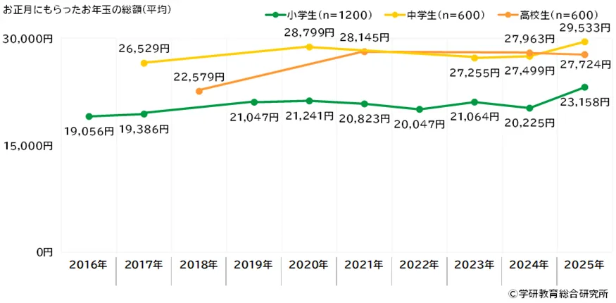 まず注目したいのは、2025年におけるお年玉の金額です。小学生は平均23,158円、中学生は29,533円、高校生は27,724円を受け取ったと報告されています。この金額は小学生と中学生では前回調査からそれぞれ2,933円、2,034円と増加したのに対し、高校生は239円の減少がみられました。分配される金額が年齢とともに変わる様子が興味深いです。