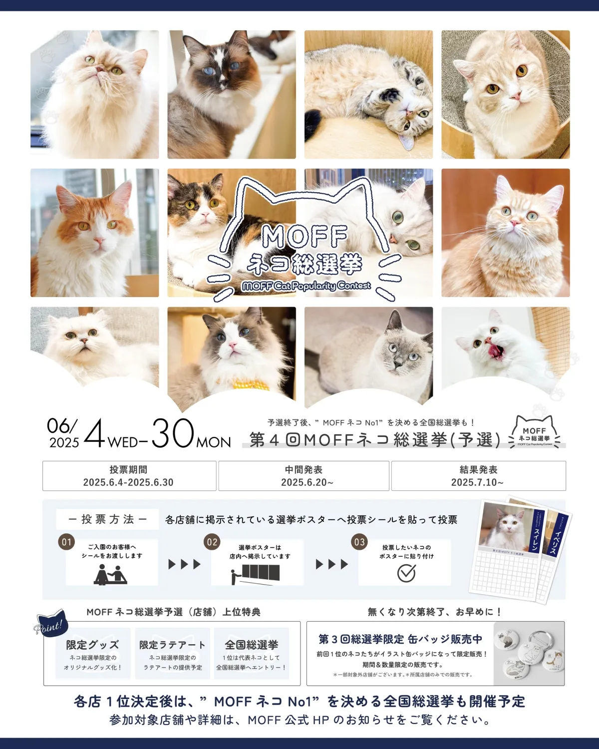 MOFFネコ総選挙は、全34店舗で実施され、店舗ごとに代表猫を選出する予選が行われます。各店舗の第1位は、全国から集まった代表猫たちとともに、本選に臨みます。これにより、全国で最も愛される猫を決定する大きなイベントとなります。参加する猫たちの特徴や性格は多種多様で、どの猫に投票するか選ぶのも楽しみの一つです。