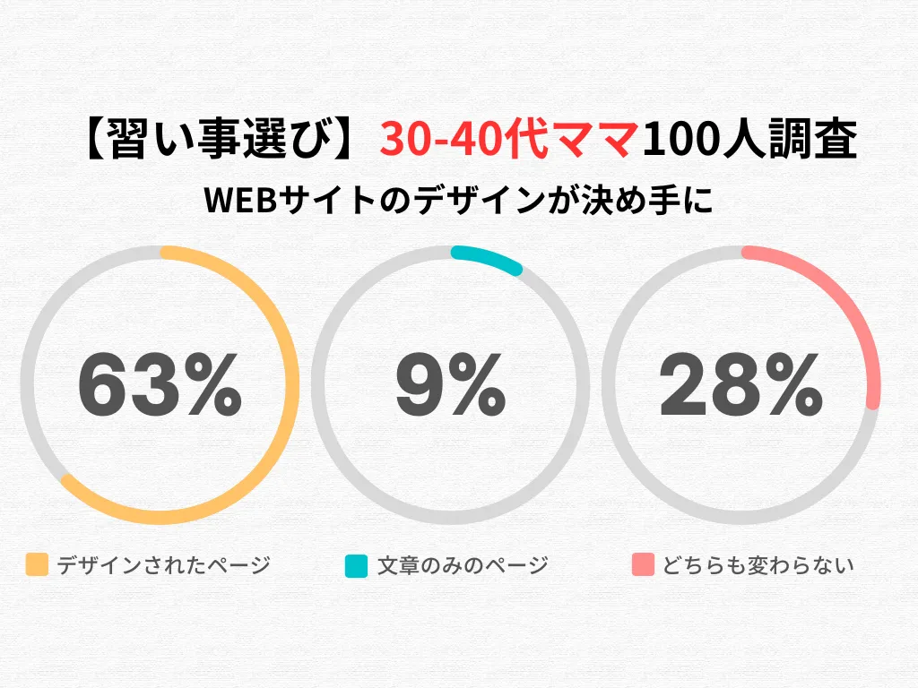 結果として、対象者の63%が「デザインされたページ」を支持し、わずか9%が「文章のみのページ」と回答しました。残りの28%は「どちらも変わらない」とのことです。このデータから、保護者が視覚的な情報提示を重視していることが浮かび上がります。特に、信頼性や安心感は子どもの習い事を決める際には決定的な要素です。