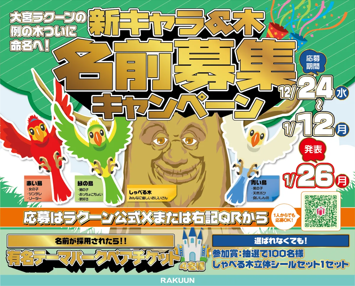 埼玉県さいたま市の大宮ラクーンが運営するマスコットキャラクター「しゃべる木」が、12月24日(水)にリニューアルを果たしました!樹齢100年以上のこの木は、おじいさんのような優しさを持ちながらも、そのコミカルな性格から多くのファンに愛されてきました。さらに今回は、新たに3人の仲間たち、赤い鳥、青い鳥、緑の鳥が参加し、賑やかな仲間たちの舞台が整いました。