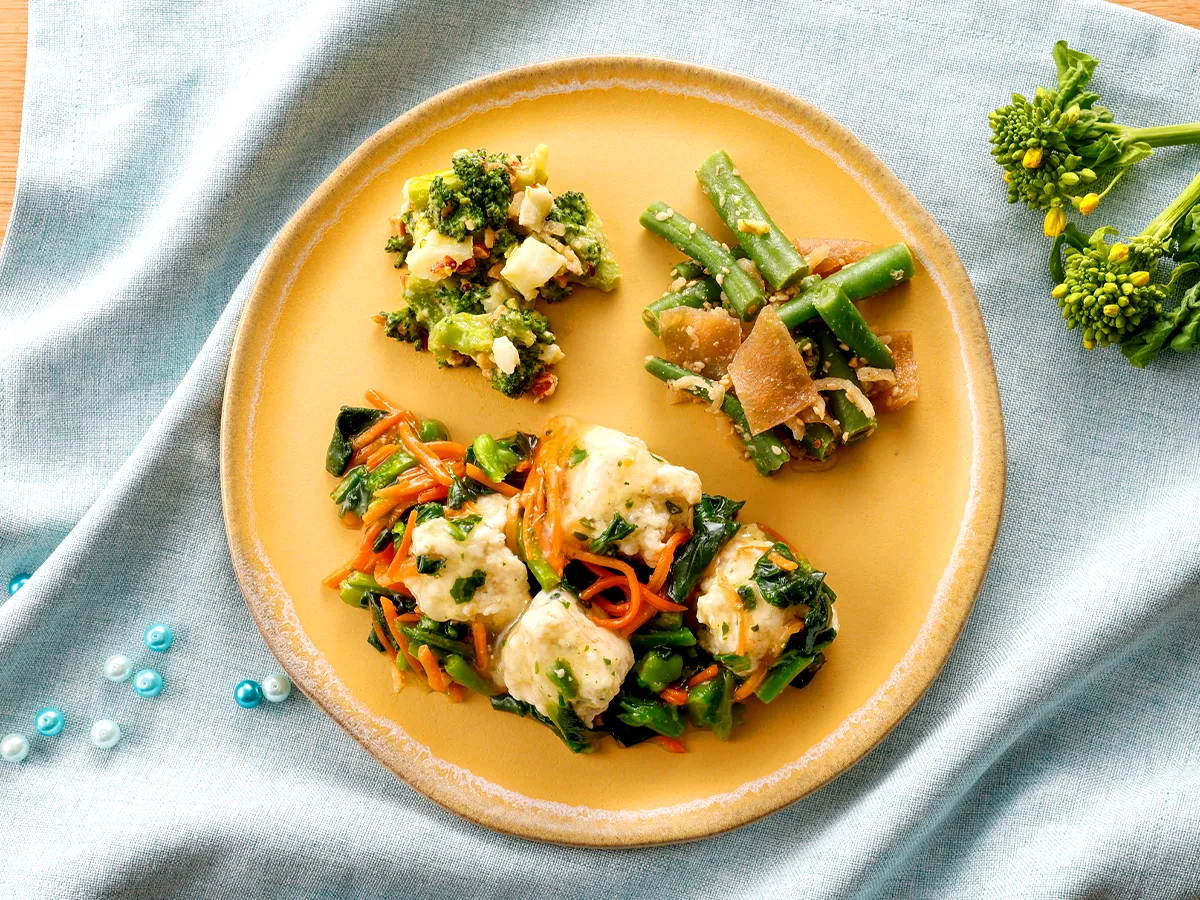 プレートには、菜の花や人参が添えられ、一口ごとに旬の彩りと出汁の旨味が広がる工夫がされています。菜の花のほろ苦さが出汁あんと相性抜群で、春の訪れを感じることができる仕上がりです。そして、副菜として用意されたまろやかなブロッコリーの卵サラダや食感の良いインゲンと大根のごま和えが、全体のバランスをさらに整えています。