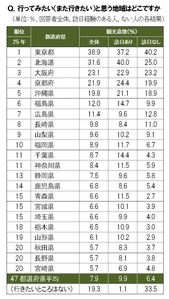 一方で、訪日経験のない人々に関しては、広島県や長崎県などが高評価を得ている状況で、地域ごとに異なる観光意欲があることが確認されました。