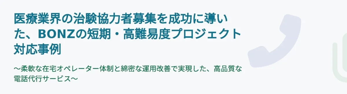 株式会社ボンズコミュニケーション(神奈川県横浜市)は、大手製薬関連企業の新薬治験に向けた協力者募集プロジェクトを支援し、その成功を収めたことを発表しました。この取り組みでは、短期間での高品質なコールセンターを立ち上げるという難題に挑み、クライアントの期待に応えました。