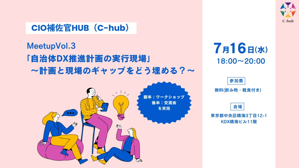 2025年7月16日(水)、東京都中央区にある株式会社うるるが主催するコミュニティ「CIO補佐官HUB」が、待望のイベント「C-hub Meetup Vol.3」を開催します。これは、自治体のデジタルトランスフォーメーション(DX)を支えるCIO補佐官が集まり、実務的な知見を共有したり新たなつながりを築く場です。