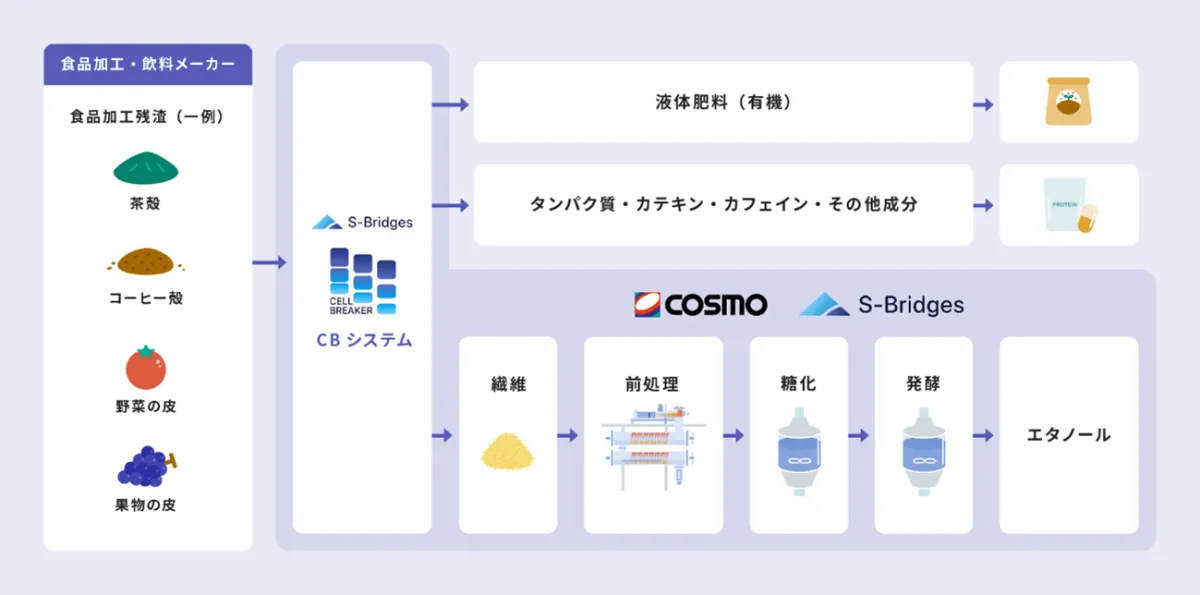 S-Bridgesは、食品加工の過程で未利用となる植物由来の素材を100%有価物化することを目標としています。同社が自身の技術である「Cell Breaker®」システムを駆使し、茶葉やコーヒー原料などからタンパク質や液肥原料などを抽出します。この過程で得られるセルロース系繊維を利用して、コスモエネルギーはバイオエタノールの原料として活用することを目指しています。