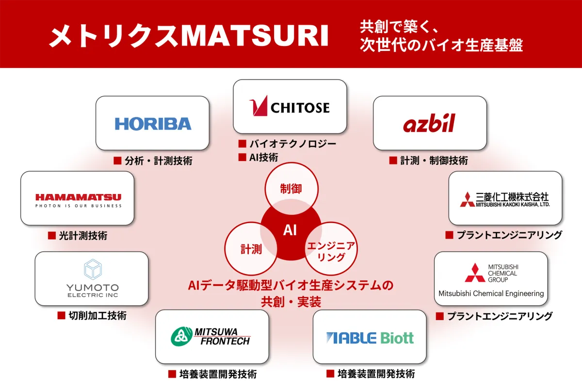 プロジェクトでは、計測、制御、エンジニアリングなど異なる分野の企業が連携し、ちとせが開発したAI自律培養制御技術を基盤技術として採用。これにより、データ駆動型のバイオ生産設備を共同で創り上げることを目指しています。