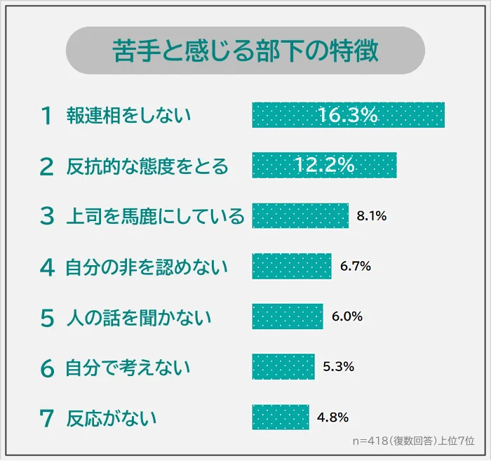 調査の結果、職場に苦手な部下がいると答えた上司は83.3%に達しました。特に注目すべきは、苦手な部下の特徴として第一位に「報連相をしない」が挙げられた点です。