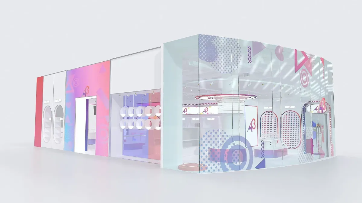 店舗デザインは、A3のロゴカラーを基にした色合いで装飾され、未来的なディスプレイ什器を配置。このデザインは、企業のモットーである「楽しさで世界をポジティブに」というメッセージを具現化し、来店者に遊び心や新しさを感じさせるでしょう。