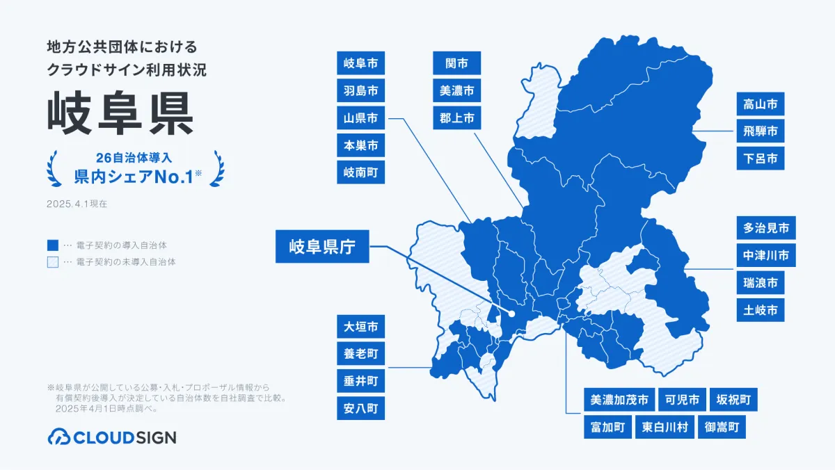 岐阜県内の自治体でクラウドサインを採用しているのは、岐阜県庁や岐阜市、大垣市、高山市など、県内の60%にあたる26の自治体です。この導入率は、全国の平均である20%を大きく上回っており、地方自治体において電子契約サービスを導入した自治体数では、クラウドサインが全国一のシェアを誇っています。