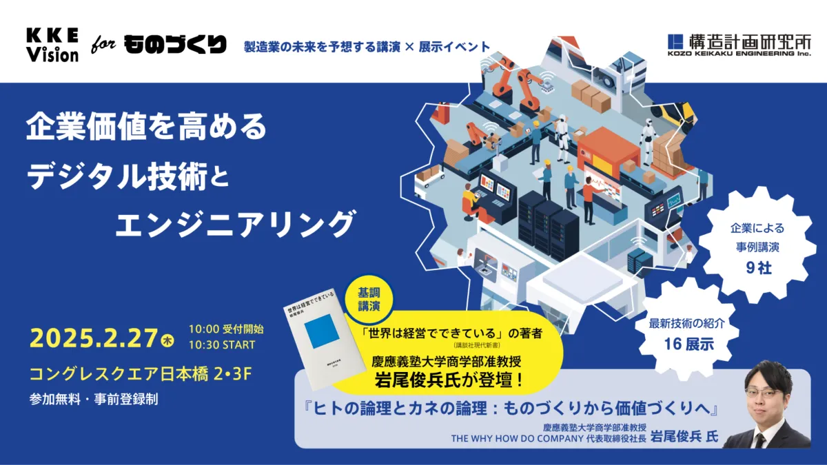 2月27日に開催される「KKE Vision for ものづくり」は、株式会社構造計画研究所主催の注目イベントです。このイベントでは、参加者は製造業の未来を見据えた講演や展示を体験することができます。大会場となるコングレスクエア日本橋では、専門家による講演のほか、企業による実際の事例紹介やデジタル技術のデモが行われます。