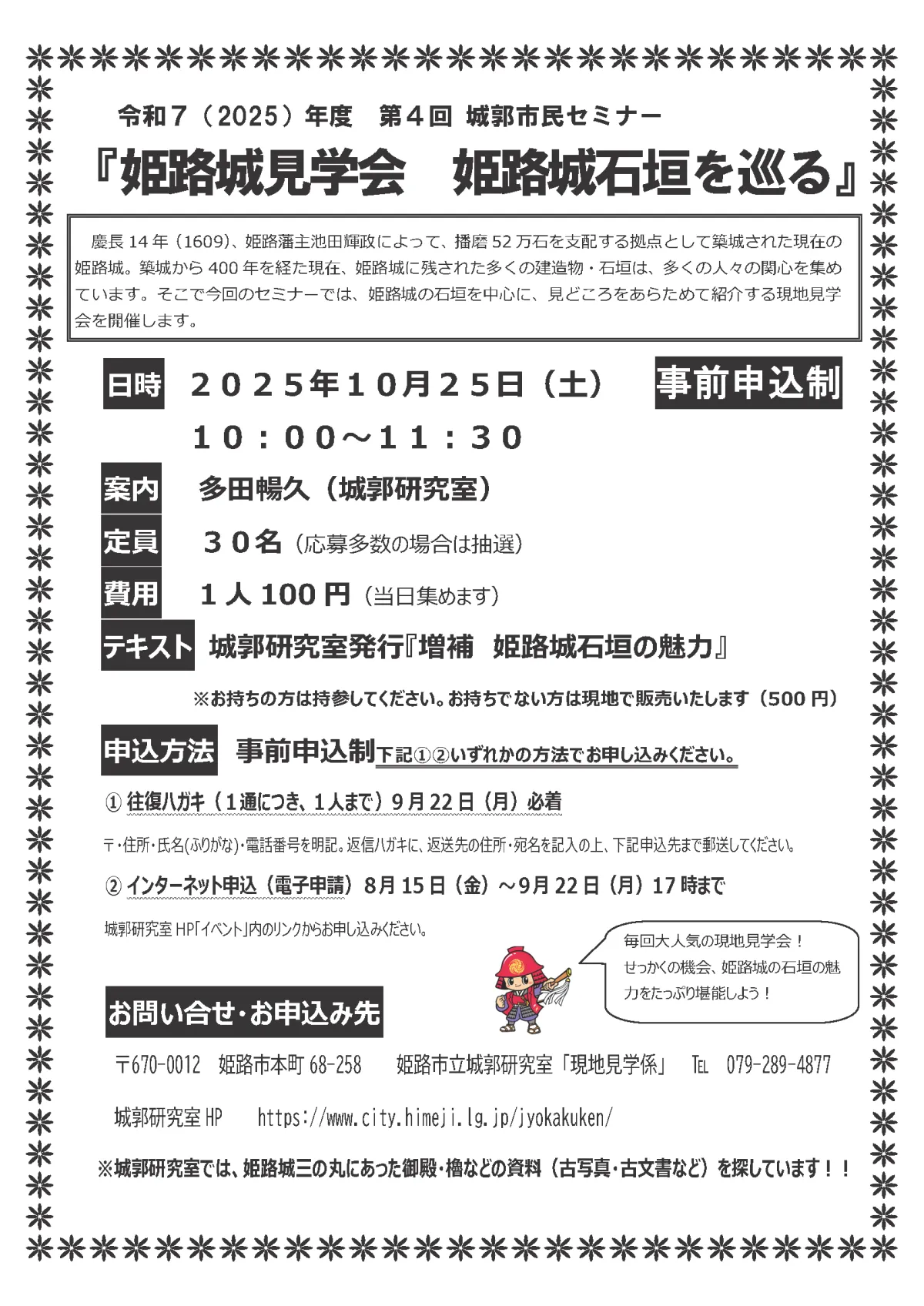 〒670-0012 姫路市本町68-258 城郭研究室「現地見学」係 電話079-289-4877