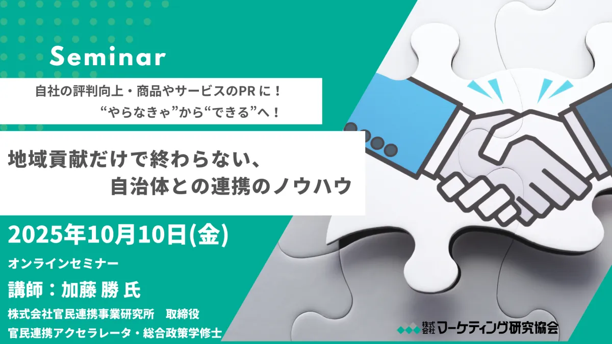 2025年10月10日に、株式会社マーケティング研究協会が主催する「地域貢献だけで終わらない、自治体との連携のノウハウ」というオンラインセミナーが開催されます。このセミナーでは、企業が自治体と連携して社会課題を解決するための具体的なノウハウを提供し、事業の発展を目指す内容となっています。