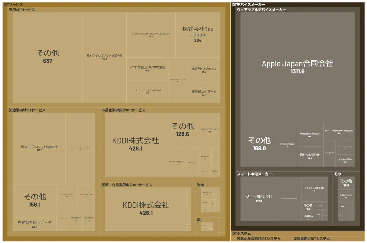 IoT業界カオスマップのページでは、高度なデータ可視化ツールを使用して、各企業の位置づけを詳しく確認できます。市場の面積はそれぞれの規模を示しており、視覚的にインパクトがあります。カオスマップの概要ページには、以下のURLからアクセス可能です: