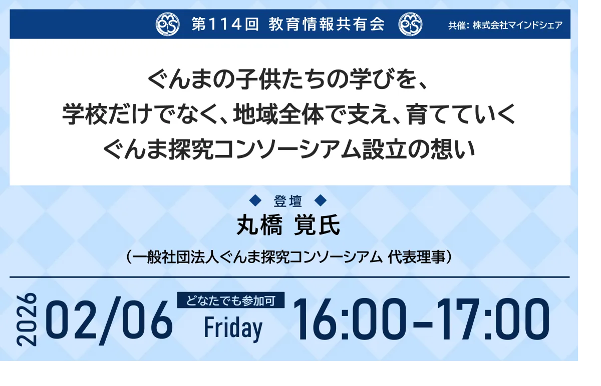 教育は地域や社会全体が共に支えるものというのが、今回の教育情報共有会のテーマです。開催される第114回教育情報共有会は、「ぐんまの子供たちの学びを、学校だけでなく、地域全体で支え、育てていく」ために設立された「ぐんま探究コンソーシアム」の理念について、代表理事の丸橋 覚氏からお話しいただきます。