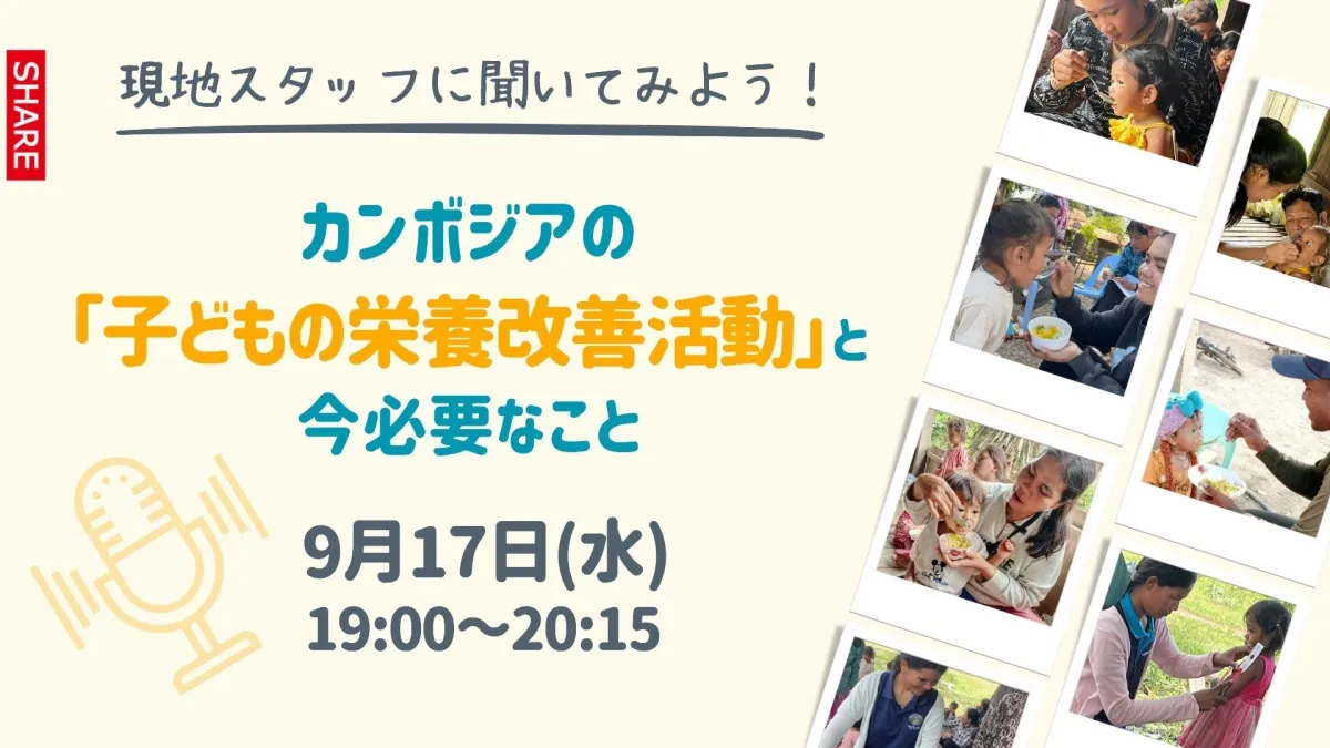 2025年9月17日(水)には、カンボジア現地のスタッフが直接参加するオンラインイベントが開催されます。参加者は自由に質疑応答ができ、カンボジアの現状や子どもたちが直面している課題、そしてその中で見える希望を聞くことができます。登壇者には、カンボジア事務所のプログラムマネージャーソク・フン氏、プログラムリーダーのチィエップ・コンティア氏、そしてモデレーターとしてシェア東京事務所の近藤光氏が参加します。彼らからは、カンボジアの栄養改善活動についての貴重な生の声が届けられる予定です。