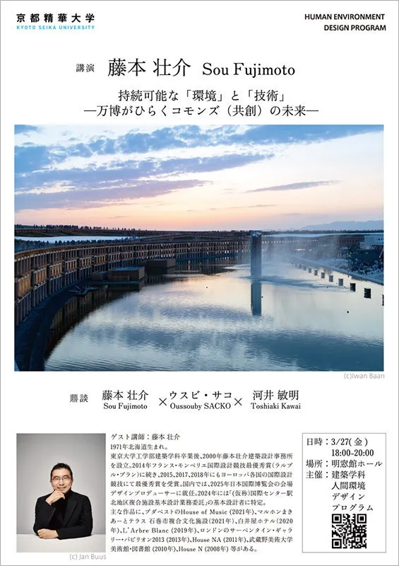2026年3月27日、京都精華大学にて、著名な建築家である藤本壮介氏を招いた基調講演「持続可能な『環境』と『技術』 —万博がひらくコモンズ(共創)の未来—」が開催されます。このイベントは、本学の人間環境デザインプログラム主催で、環境問題や技術革新について深く考える良い機会となります。