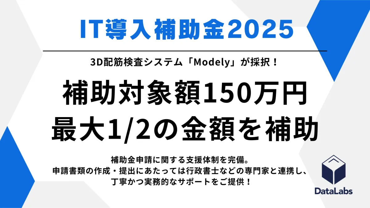 DataLabs株式会社は、東京都中央区に本社を構えるスタートアップ企業で、「3次元データで建設業を変革する」というミッションのもと、様々な建設業務を効率化するシステムを提供しています。このたび、同社が開発した3D配筋検査システム「Modely」が、2025年度のIT導入補助金制度において補助対象となることが決定しました。