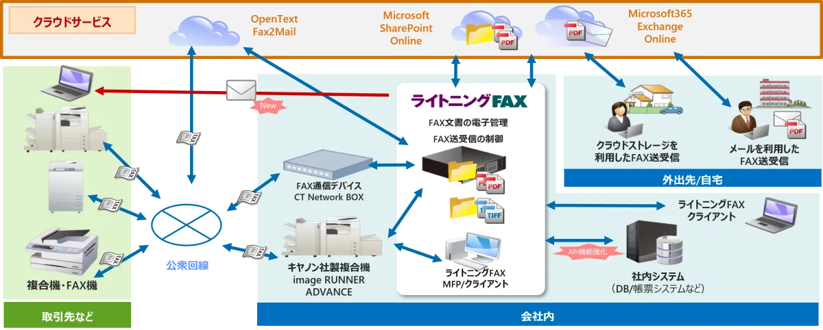 「ライトニングFAX」は、社内ネットワークにFAXを統合し、業務システムと融合したFAXソリューションです。販売管理システムや帳票システムと連携可能で、発注書の自動送信や受信FAXの文書管理システムへの連携などが実現できます。