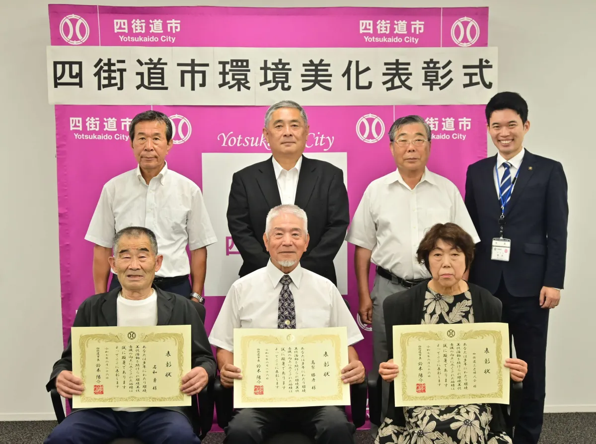 令和7年度四街道市環境美化表彰式が、6月26日木曜日に四街道市役所で開催されました。この表彰式では、市内で環境美化のための優れた活動を行った個人及び団体が表彰されました。受賞者には、髙梨勝彦氏、名和勇氏、そして四街道三区婦人会が選ばれました。