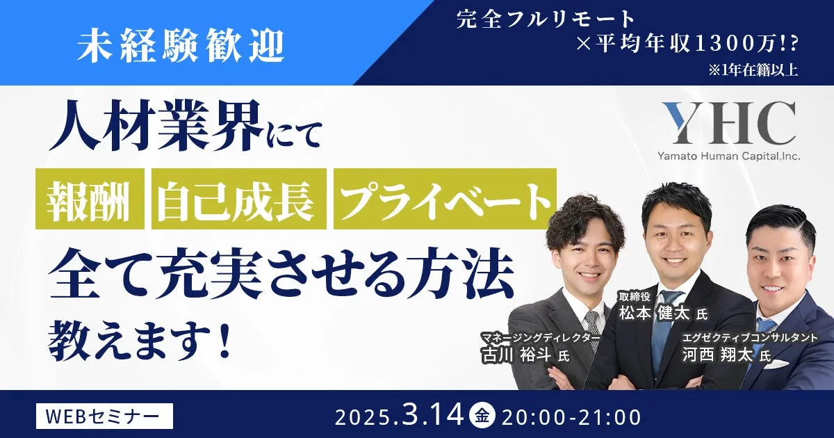 2025年3月14日(金)20:00より、ヤマトヒューマンキャピタル株式会社が主催するオンラインウェビナー『人材業界にて報酬、自己成長、プライベート全て充実させる方法教えます!』が開催されます。このウェビナーでは、フルリモートワークの魅力や就業の自由について詳しくお話しします。