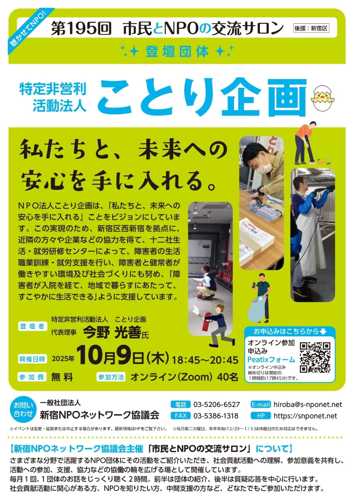 2025年10月9日(木)に、特定非営利活動法人ことり企画による「市民とNPOの交流サロン」が開催されます。このイベントはオンラインで行われ、社会貢献活動に関心のある方々が集まる場として、毎月定期的に実施されています。