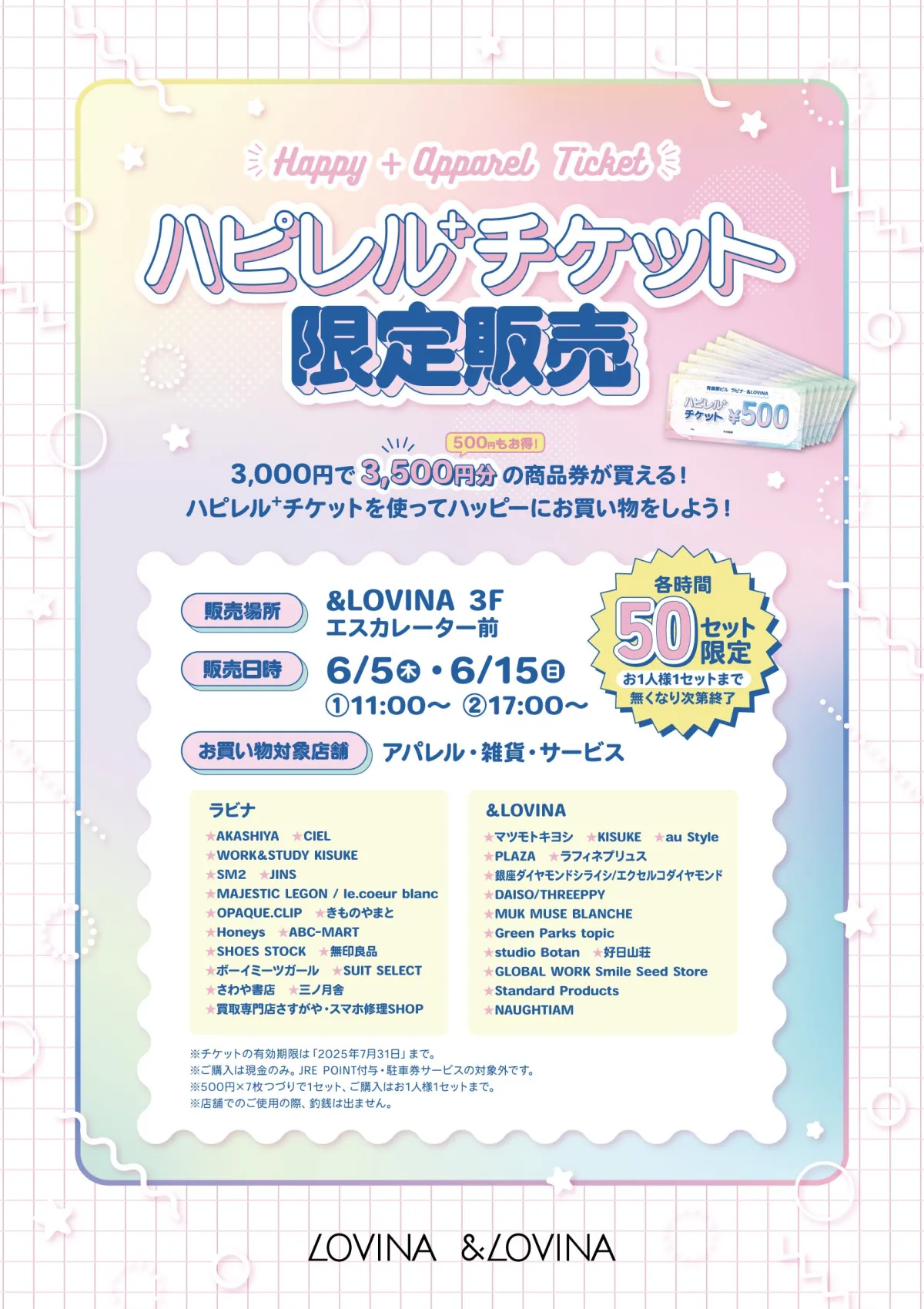 対象店舗はラビナと&LOVINAにあるアパレルや雑貨、サービスの店舗です。チケットがあれば、様々なお店でお得なお買い物が楽しめます。詳細については、館内に掲示されているポスターや公式ウェブサイト、SNSをご確認ください。
